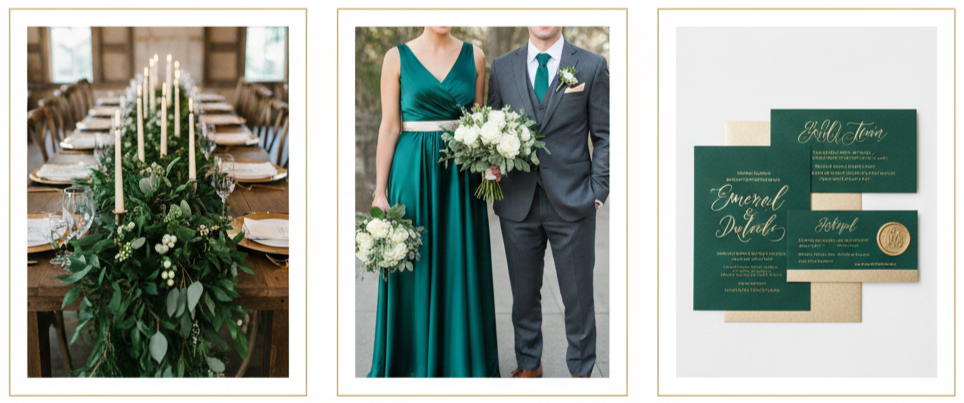 - Color mood: This combination delivered a lush, vintage feel with just the right amount of softness. Emerald added richness, and champagne softened the look with subtle sparkle.