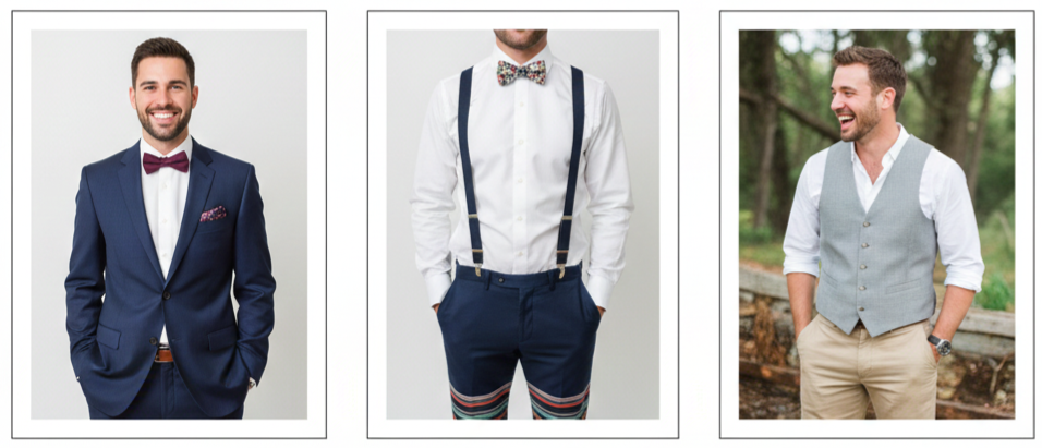 - Playful Accessories: Bow ties, suspenders, patterned socks, and pocket squares added flair. Grooms used these details to bring character to their look without overshadowing the bride.