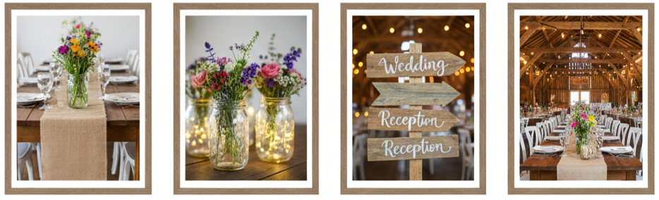 | Rustic-Chic | Barns, Farms | Mason jars, burlap, wood signs | Lace sleeves, soft curls |