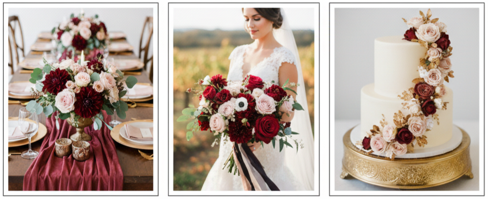 Marsala, Pantone’s Color of the Year, brought a rich and romantic touch. Paired with blush, gold, or ivory, it gave depth to floral designs and added warmth to winter or fall weddings.