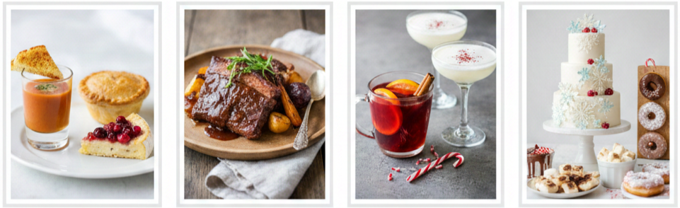 - Desserts: Cakes and treats included snowflake cupcakes, sugared berries, or frosted cookies. Dessert stations featured s’mores setups, donut walls, or even hot cider stands for a whimsical twist.