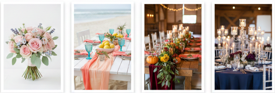 | Summer | Coral, Turquoise, Peach, Lemon Yellow | Beach, Vineyard, Casual |