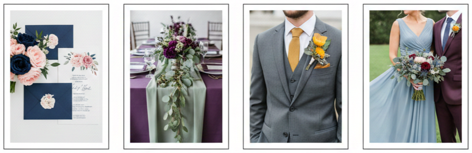 Keep your palette to two or three main colors and use them consistently in attire, décor, and florals. Add neutrals or metallics to balance the look.