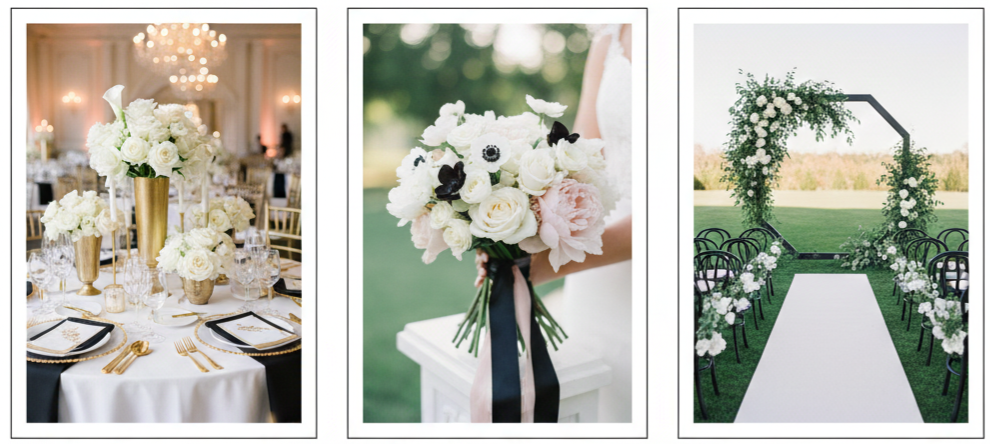 - Popular combinations: Black and white paired with gold for glam weddings, with blush for a romantic feel, or with fresh greenery for a more modern touch.