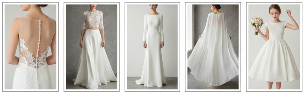 Two-piece bridal sets also gained popularity. Brides loved the flexibility of separates, and the look worked well for boho weddings, outdoor ceremonies, or reception outfit changes. Minimalist gowns stood out as well, especially for brides who wanted clean lines and a modern, confident style. These dresses often featured structured shapes, smooth satin, matte crepe, or simple buttons down the back. Another big shift was the use of bridal capes and capelets. Instead of choosing a traditional veil, many brides wore dramatic cape styles that added movement, elegance, and a fashion-forward vibe.