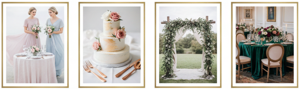 We also saw a strong rise in metallic tones that gave wedding décor a sleek and elevated feel without looking overly formal. Rose gold, copper, and brushed gold became go-to choices for centerpieces, flatware, candle holders, and even cake decorations. For couples who wanted a more nature-inspired style, earthy neutrals like taupe, sage, and stone gray were popular because they blended beautifully with rustic venues and outdoor spaces. Fall and winter weddings leaned into jewel tones like emerald, burgundy, and sapphire, which added richness and made everything feel dramatic and luxurious, especially when paired with velvet or textured floral arrangements.