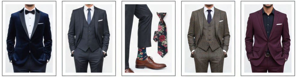 Accessories were another major way grooms expressed themselves. Floral ties, patterned socks, and unique pocket squares brought color and character into formal outfits. Many grooms also chose three-piece suits, which created a sharper silhouette and looked great in photos. Dark jewel tones replaced standard gray for couples who wanted a bold, modern look. Tailoring mattered more than ever, and fitted suits became the expectation rather than the exception. Some grooms also skipped traditional ties and chose bow ties or open-collar styling for a relaxed yet intentional look.