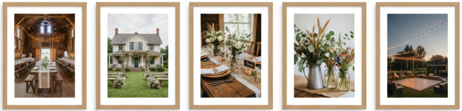 | Barn/Farmhouse Venue | Wood beams, open fields, countryside views | Ceremony + reception setup |