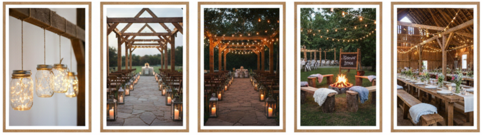 | Wooden & Earthy Decor | Farm tables, burlap, wildflowers, signage | Natural rustic atmosphere |