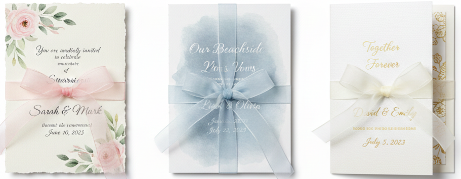Affordable ribbon wedding invites give you a simple way to add charm and elegance to your wedding stationery without stretching your budget. By choosing a ribbon style that fits your theme, keeping your design clean, and planning your assembly approach early, you can create invitation suites that look thoughtfully designed and professionally finished. Whether you order pre-made invites or build your own DIY set at home, ribbon adds a special touch that guests notice right away, and it helps your stationery feel more memorable from the start.