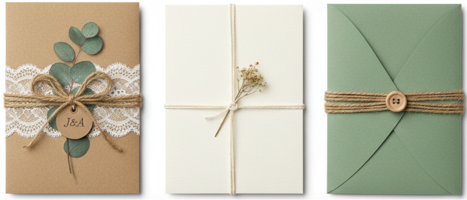 Velvet ribbon adds softness and richness, which makes it perfect for fall and winter weddings or any invite set that needs a touch of luxury. It’s usually more expensive than satin, yet it still stays affordable when used in smaller widths. Twine and natural fiber ribbon work best for rustic weddings and give a handmade feel, especially when paired with kraft paper or earthy colors.