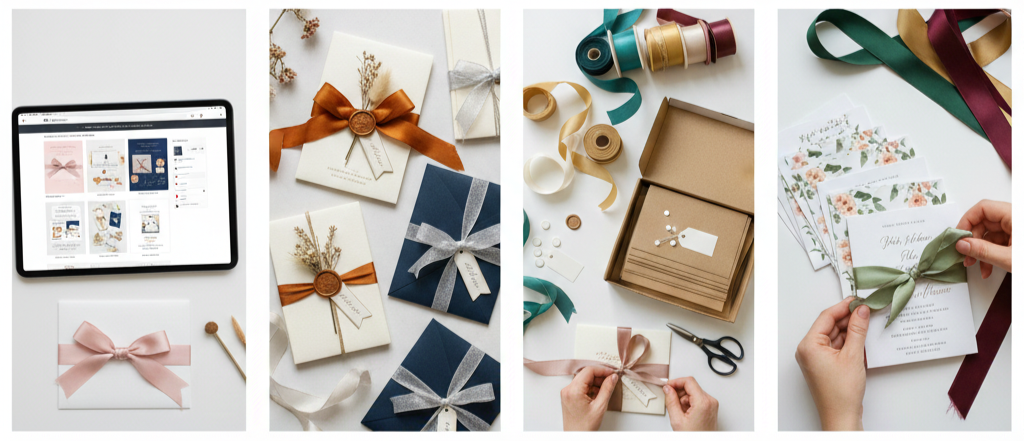 If you want the most budget control, craft stores and online marketplaces sell invitation kits and ribbon spools that allow you to build your own sets at home. Local print shops are another underrated option. They can print your design on good-quality paper, and you can bring your own ribbon to keep costs lower while still getting professional printing.
