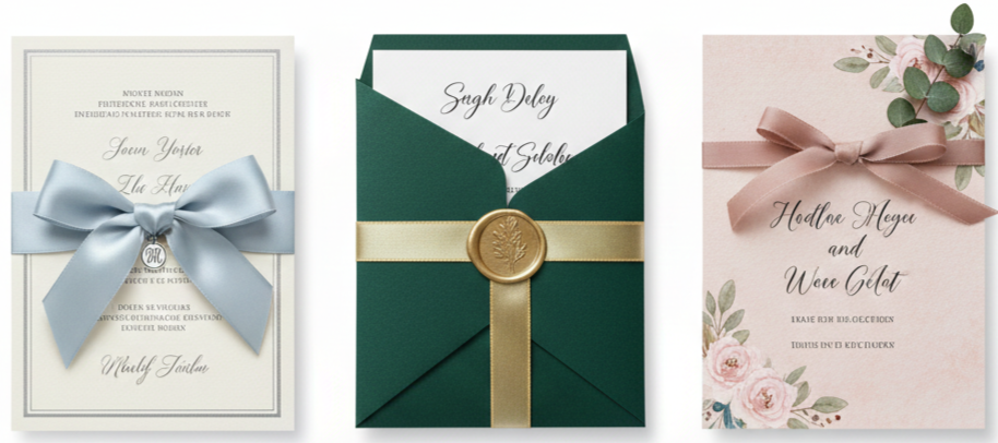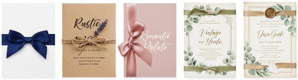 Vintage-inspired invitation styles can look incredible when paired with elegant ribbon choices. Ivory paper, gold ribbon, and a wax seal can feel luxurious without needing fancy printing. Botanical themes also pair beautifully with ribbon. A soft green velvet ribbon or neutral twine complements floral designs without competing with them.