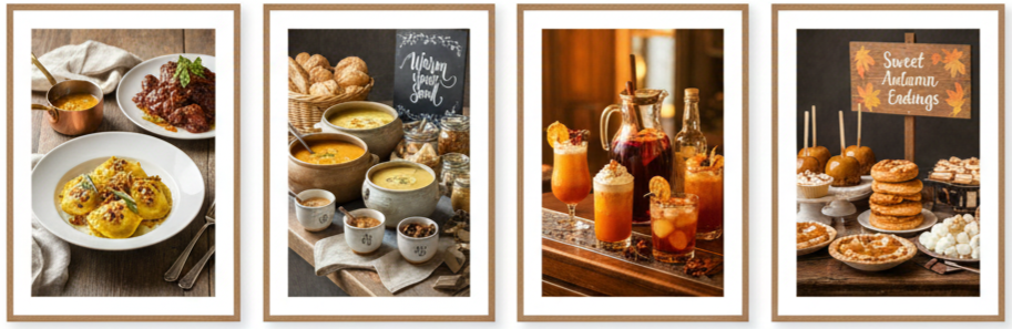 Fall drinks and desserts are also easy to style. Cinnamon sticks, dried orange slices, and warm-toned signage make even simple stations feel polished.