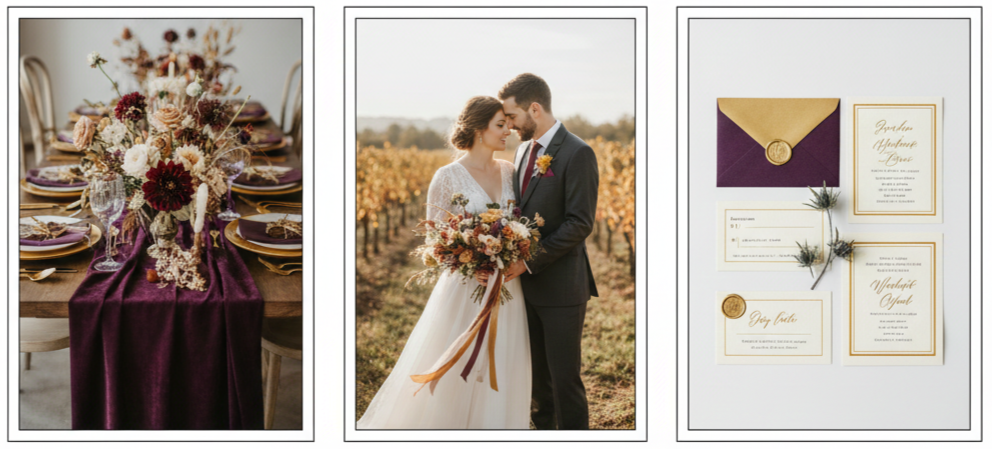 | Plum & Mustard Yellow | Navy, Champagne | Bold, Seasonal |