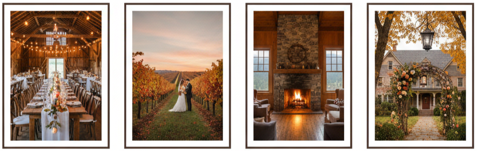 Autumn venues stand out because the surroundings do so much of the work for you. The best fall venues either highlight nature’s colors outdoors or create a warm, cozy atmosphere indoors. Many couples also prefer venues that offer indoor and outdoor flexibility, since weather can shift quickly in autumn.