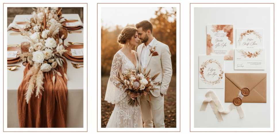 Autumn weddings feel instantly cozy because the season comes with built-in color inspiration. You get deep reds, rich oranges, warm browns, soft neutrals, and golden tones that look stunning in photos and also feel natural in real life. A good fall palette usually has one or two lead shades, then a few supporting tones that keep everything balanced. When your colors stay consistent across your flowers, outfits, stationery, and décor, the entire wedding looks more polished without feeling overplanned.