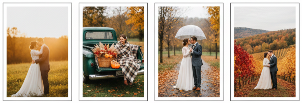 Talk with your photographer early so they can plan lighting, backup locations, and photo timing. In fall, daylight fades faster, so schedule matters more than most couples expect.