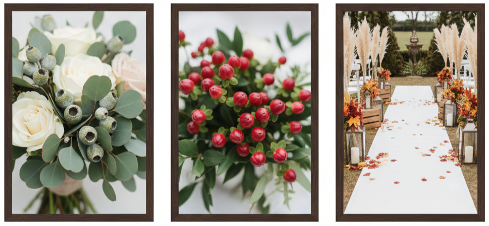 - Autumn Leaves: Use small accents of colorful leaves in bouquets or aisle décor for a natural seasonal touch.