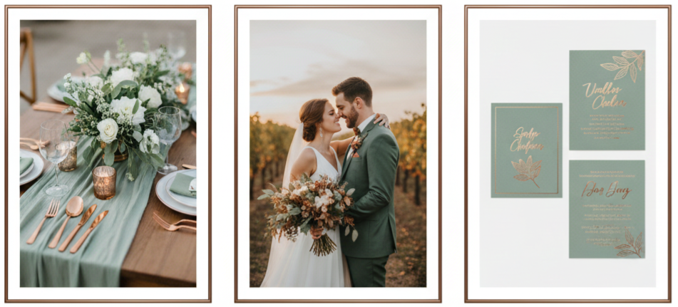 Sage creates a calm, natural base, while copper adds shine and depth. This palette fits vineyard weddings, garden venues, and rustic spaces.