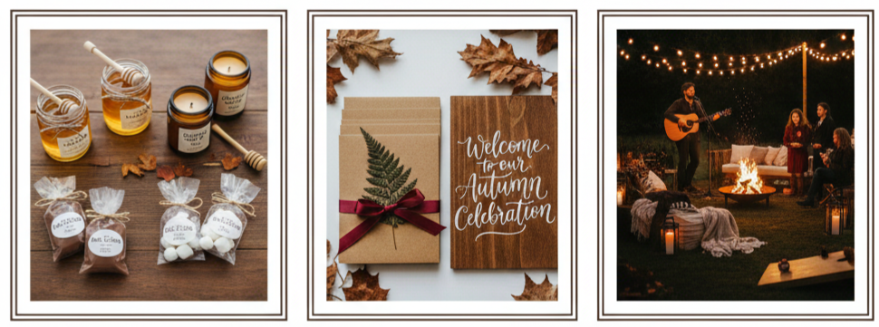 - Guest Favor Ideas: Candles in warm scents, mini jars of honey or apple butter, hot cocoa kits, and personalized blankets all fit the season perfectly.