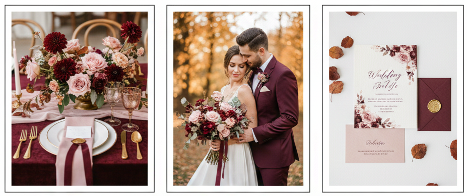 | Burgundy & Blush | Rose Gold, Ivory | Romantic, Classic |