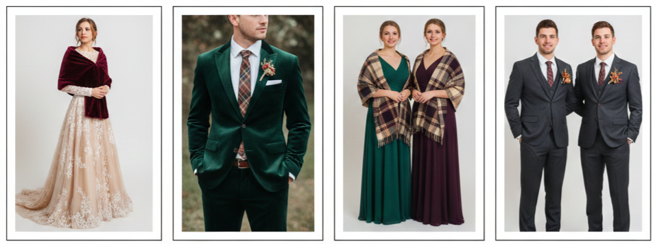 - For the groom: Tweed or velvet suits in burgundy, forest green, or deep gray feel seasonally right. Plaid ties or patterned pocket squares offer a polished finish.