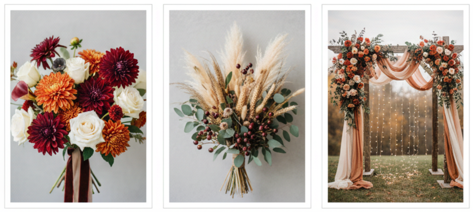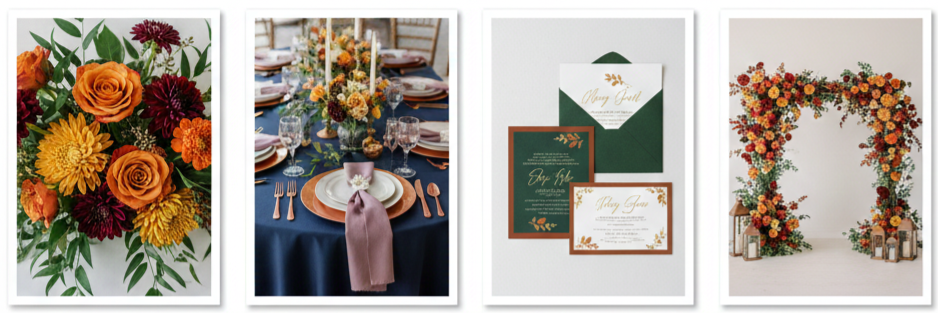- Design ideas: Ceremony arches wrapped in autumn florals create stunning backdrops. Table arrangements and bouquets that echo your palette make every space feel connected.