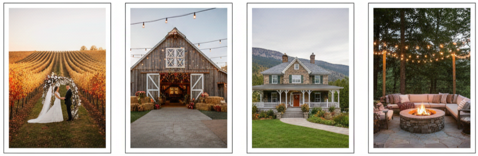- Best options: Vineyards turn gold and red in autumn, offering stunning photo opportunities. Rustic barns bring that cozy countryside charm. Historic estates and mountain lodges give a formal or natural vibe depending on your theme.
