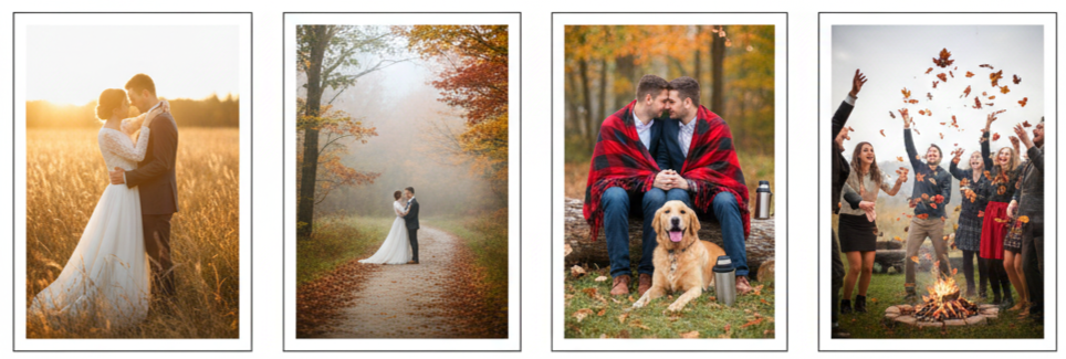 - Candid scenes: Capture guests playing with leaves, sitting by a fire, or enjoying cider to reflect the relaxed, intimate feel of your celebration.