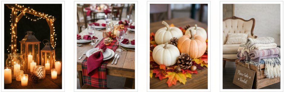 Use soft ambient lighting to match the cozy tone of the season. String lights, candles, and lanterns are perfect for creating warmth and intimacy.