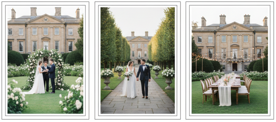 Outdoor ceremonies paired with historic homes create a romantic, refined atmosphere. Manicured lawns, stone pathways, and classic architecture add charm without excess decoration.