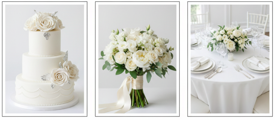 These shades create a clean, graceful foundation that feels traditional and romantic. They pair effortlessly with silver accents, soft greenery, or crystal details, making them ideal for ceremonies and receptions alike.