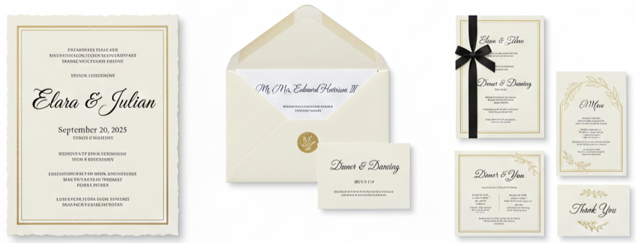 Invitations give guests their first impression of the wedding, so classic designs rely on traditional layouts and formal details rather than modern graphics.