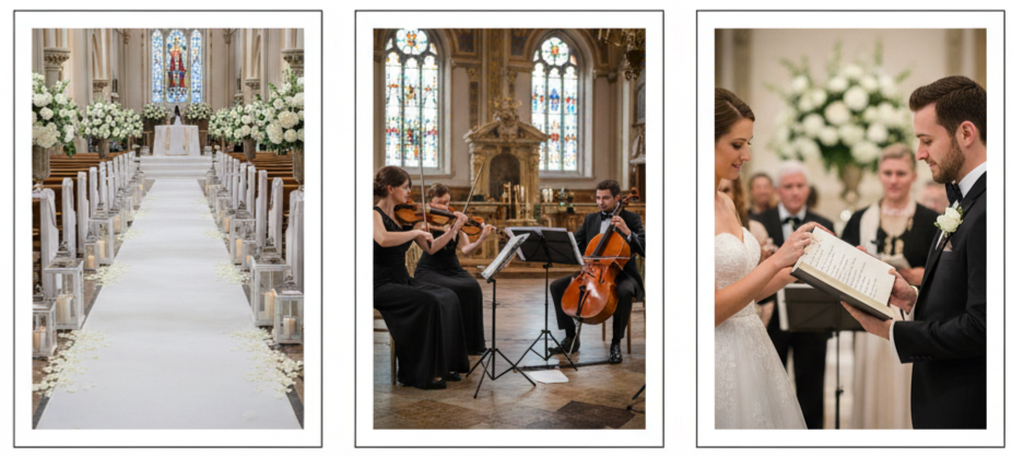 - Ceremony Music: Live music from a string quartet, harpist, or organist adds depth and formality. Canon in D, Ave Maria, and the Bridal Chorus remain popular choices for a reason.