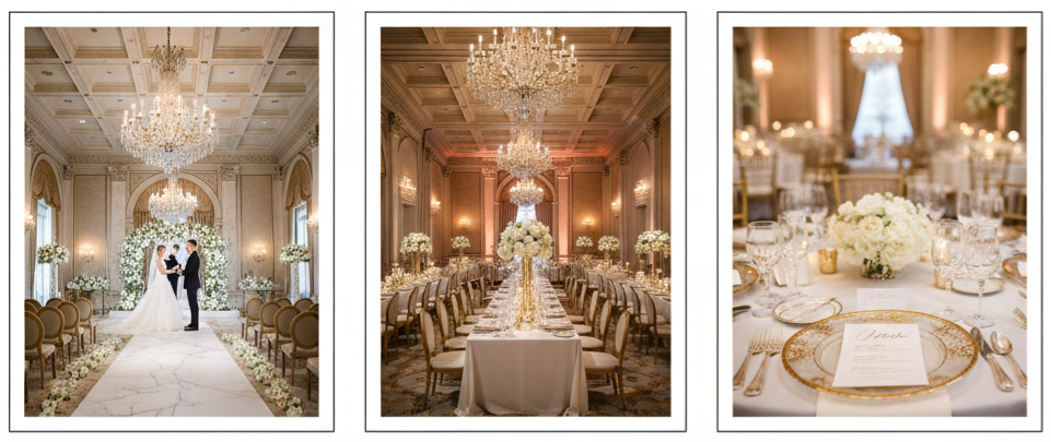 Crystal chandeliers, marble floors, and ornate detailing make ballrooms ideal for black-tie or evening weddings. The built-in elegance means minimal décor still feels luxurious.