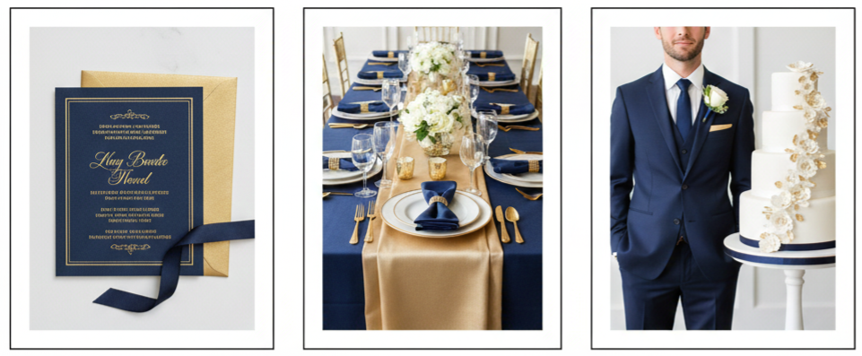 This combination adds depth and richness while still keeping things formal. Navy works well for suits, linens, and stationery, while gold details bring warmth and sophistication.