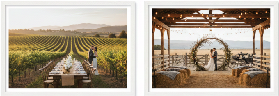 Vineyards offer scenic views with a slightly refined country feel, while ranches lean more rugged and earthy. Both settings provide wide outdoor spaces that feel relaxed and welcoming.