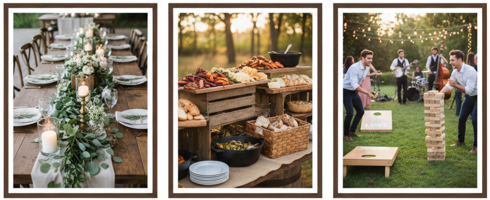 - Entertainment Options: Acoustic music, folk bands, or simple playlists match the relaxed tone. Lawn games like cornhole or giant Jenga encourage interaction among guests.