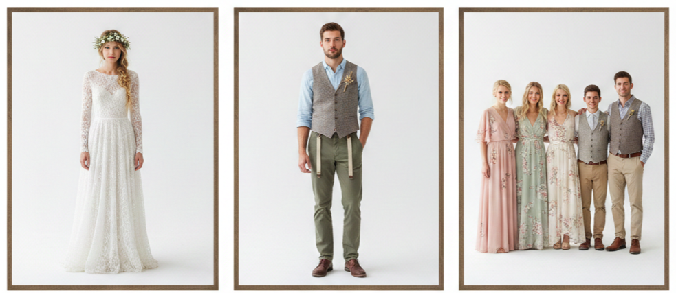 - Groom Style: Suspenders, vests, linen shirts, and relaxed tailoring replace traditional formalwear. Neutral tones with subtle texture work best.