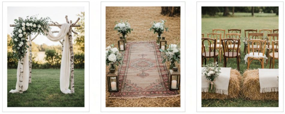 - Aisle Details: Vintage rugs, burlap runners, lanterns, and floral arrangements guide guests’ eyes toward the ceremony space while keeping the look organic.