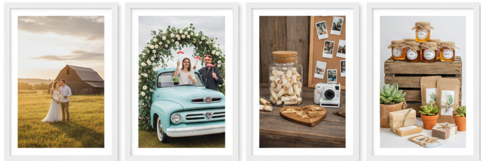 - Photo Booth Ideas: Vintage trucks, wooden benches, or floral backdrops paired with simple props give guests a fun way to capture memories.