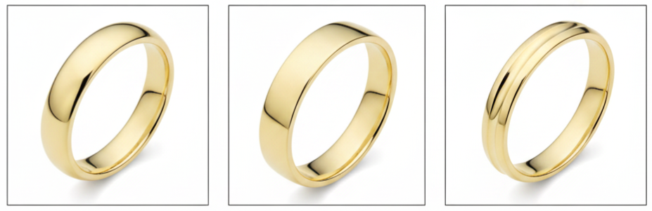 A domed ring has a rounded outer surface that reflects light softly and reads traditional. A flat profile looks modern with clean, straight lines. A knife-edge profile includes a subtle raised ridge down the center that adds structure and definition without needing stones or heavy engraving.
