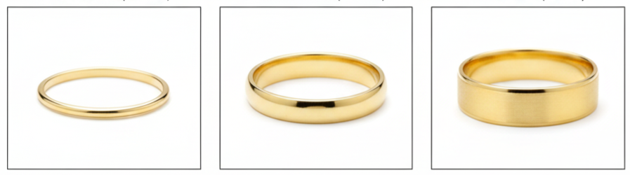Wider bands place more metal against the finger, so interior shape matters. Comfort-fit interiors usually feel better for wider widths, and trying a similar width in person makes daily comfort easier to predict.