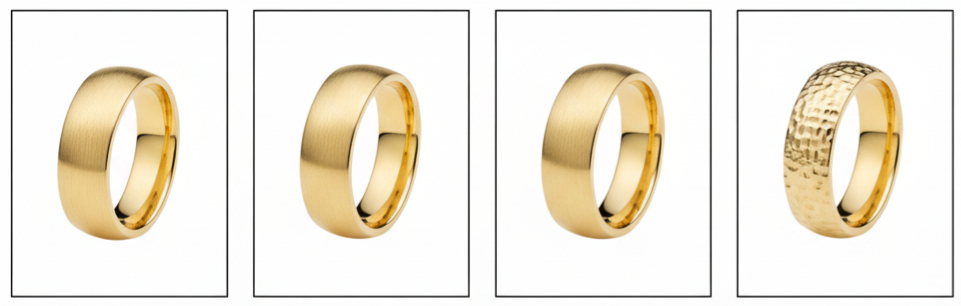 Finishes shape how the ring looks under light and how visible everyday wear becomes. A high-polish finish looks bright and reflective, though light scratches can show sooner. Brushed and satin finishes create a softer sheen and usually disguise small marks better. Matte finishes look low-shine and modern, though they may develop shine in high-contact areas. Hammered finishes add irregular texture and character, and many people like how that texture naturally hides everyday scuffs.