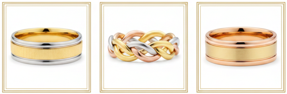 Mixed-tone rings combine two or three gold colors in one band, such as yellow and white, or yellow, white, and rose together. This style adds contrast and detail and also makes it easier to match the ring with different jewelry colors. Two-tone and tri-tone bands work well for people who wear both gold and silver accessories and want a ring that blends with everything.