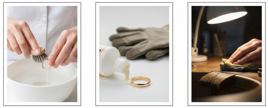 - At-Home Cleaning: Mild soap and lukewarm water work well for most gold rings. A brief soak followed by a soft brush helps remove residue, then a thorough rinse and gentle drying keeps the finish clear. This method suits plain bands and many stone-set rings, though delicate settings benefit from gentle pressure and careful handling.