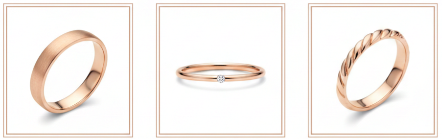 Rose gold has a soft blush tone created by mixing gold with copper. It can look subtle or more pronounced depending on the karat and finish. Rose gold has a distinctive warmth that stands out without feeling flashy, which makes it popular for couples who want something slightly different while still keeping a classic metal choice.