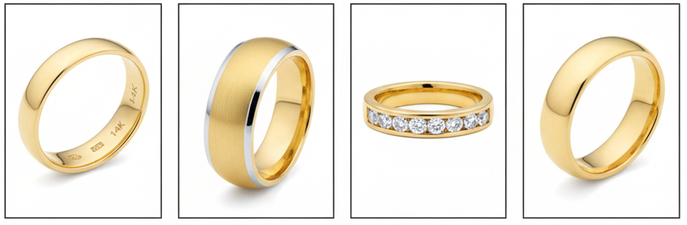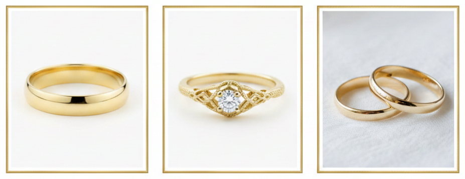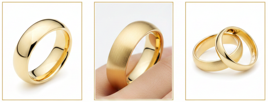 Some couples like matching sets, while others prefer rings that share a similar vibe without being identical. Both approaches work well when the choices feel intentional. Matching sets usually focus on the same gold color, the same finish, or the same profile shape. Complementary sets keep a shared element, like the same gold tone with different widths, or similar edge details that look connected while still fitting each person’s style.