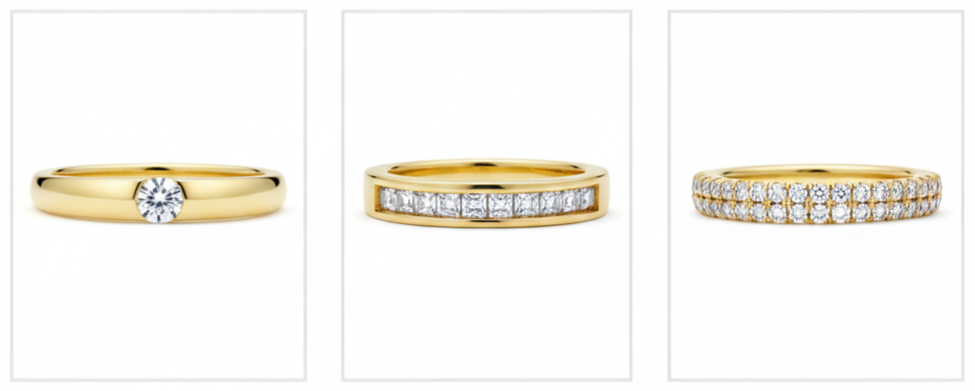 Stone accents range from subtle to bold. A single accent stone adds a small point of sparkle. Channel-set stones sit flush within a channel for a smoother silhouette. Pavé details add multiple small stones along the surface for more shine. With any stone option, secure setting work matters because daily wear includes contact, friction, and movement that can loosen stones over time.